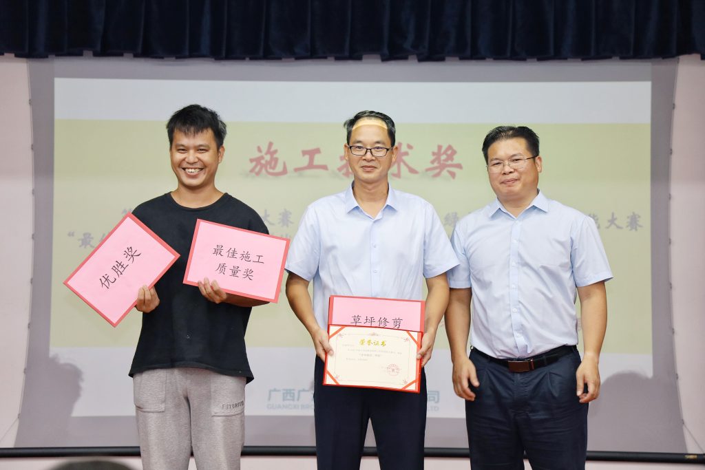 工程部韦开将、物业部农振智分别代表本部门领取了“最佳施工质量奖”和“优胜奖”、“优秀组织奖”和“草坪修剪二等奖”。